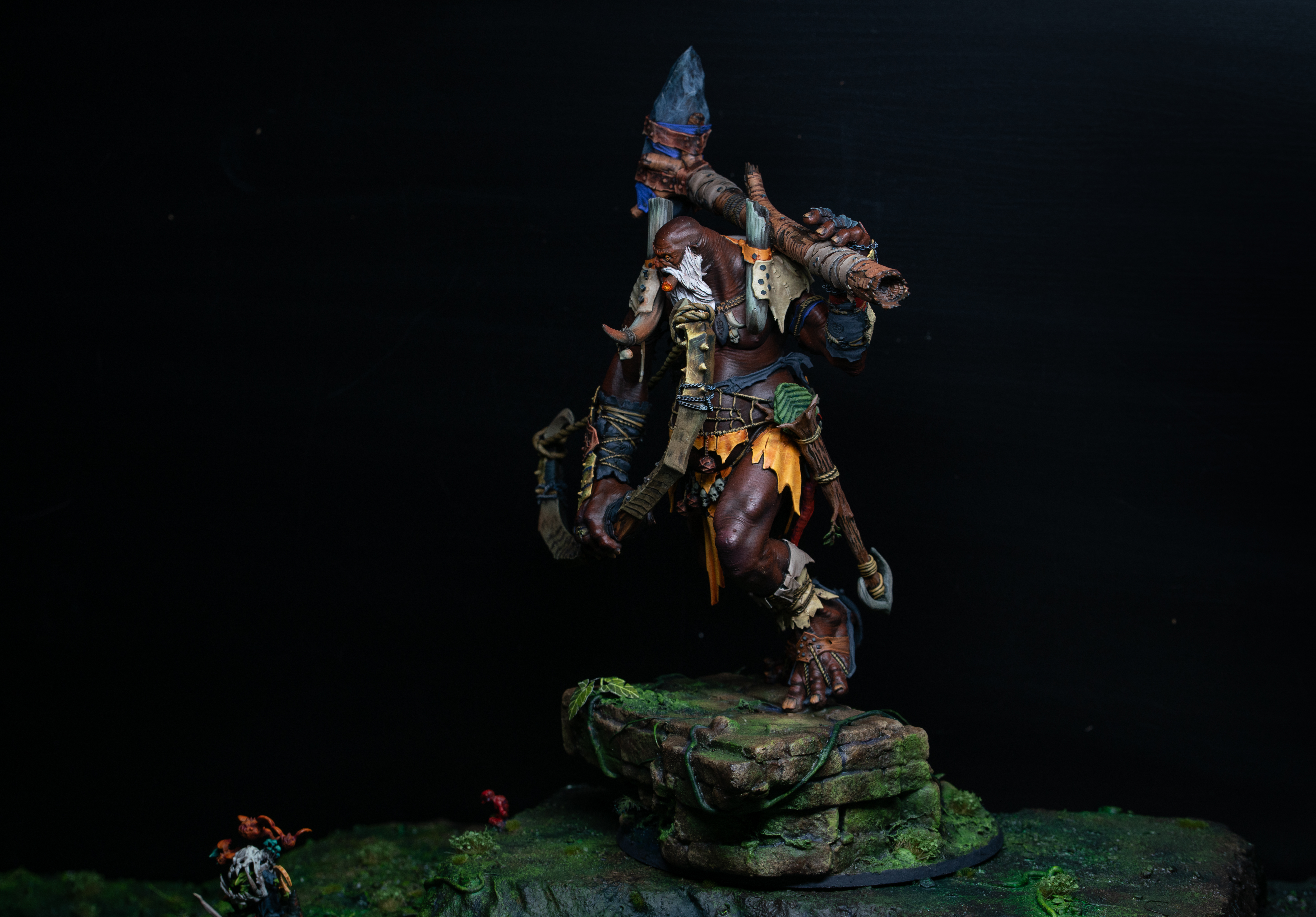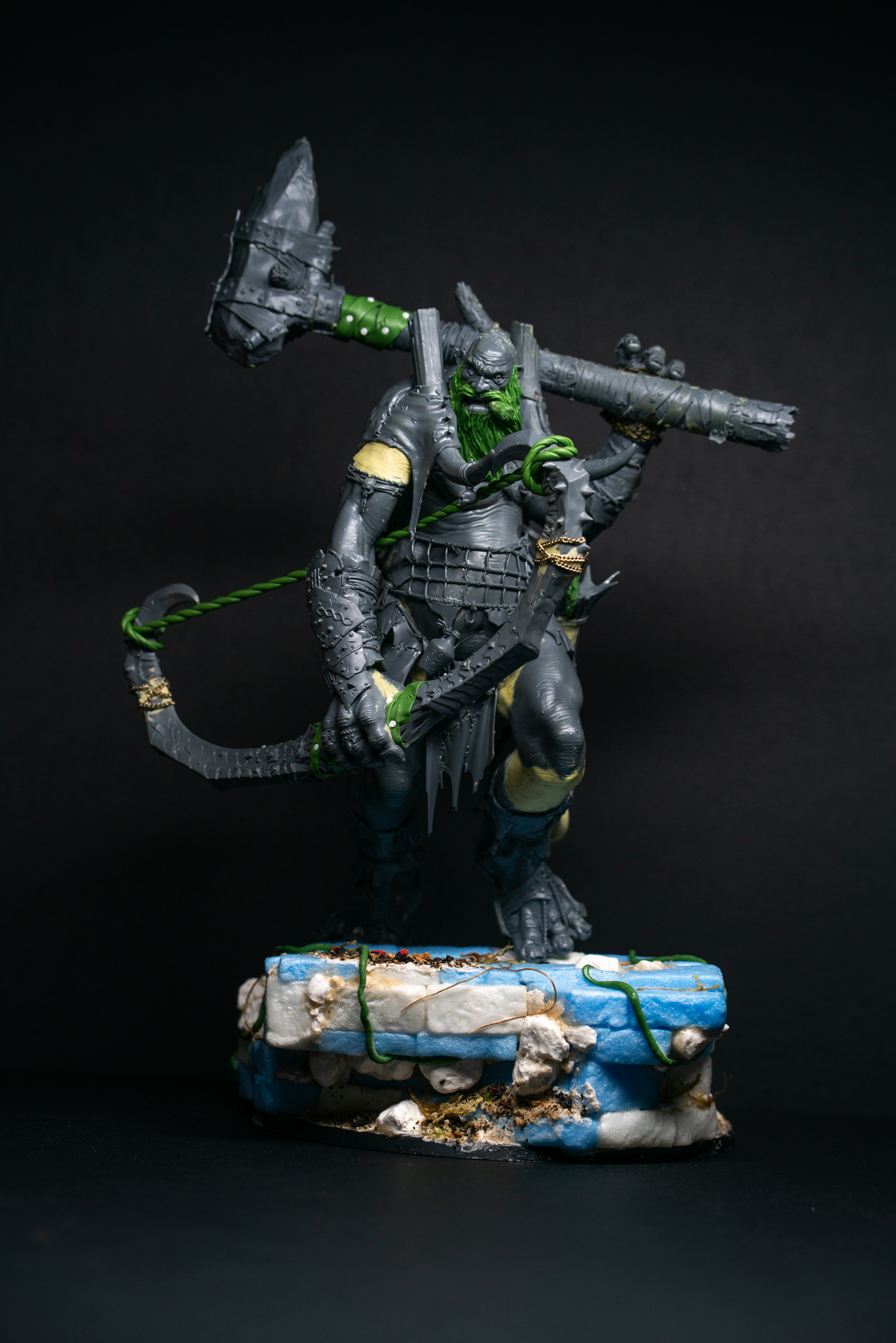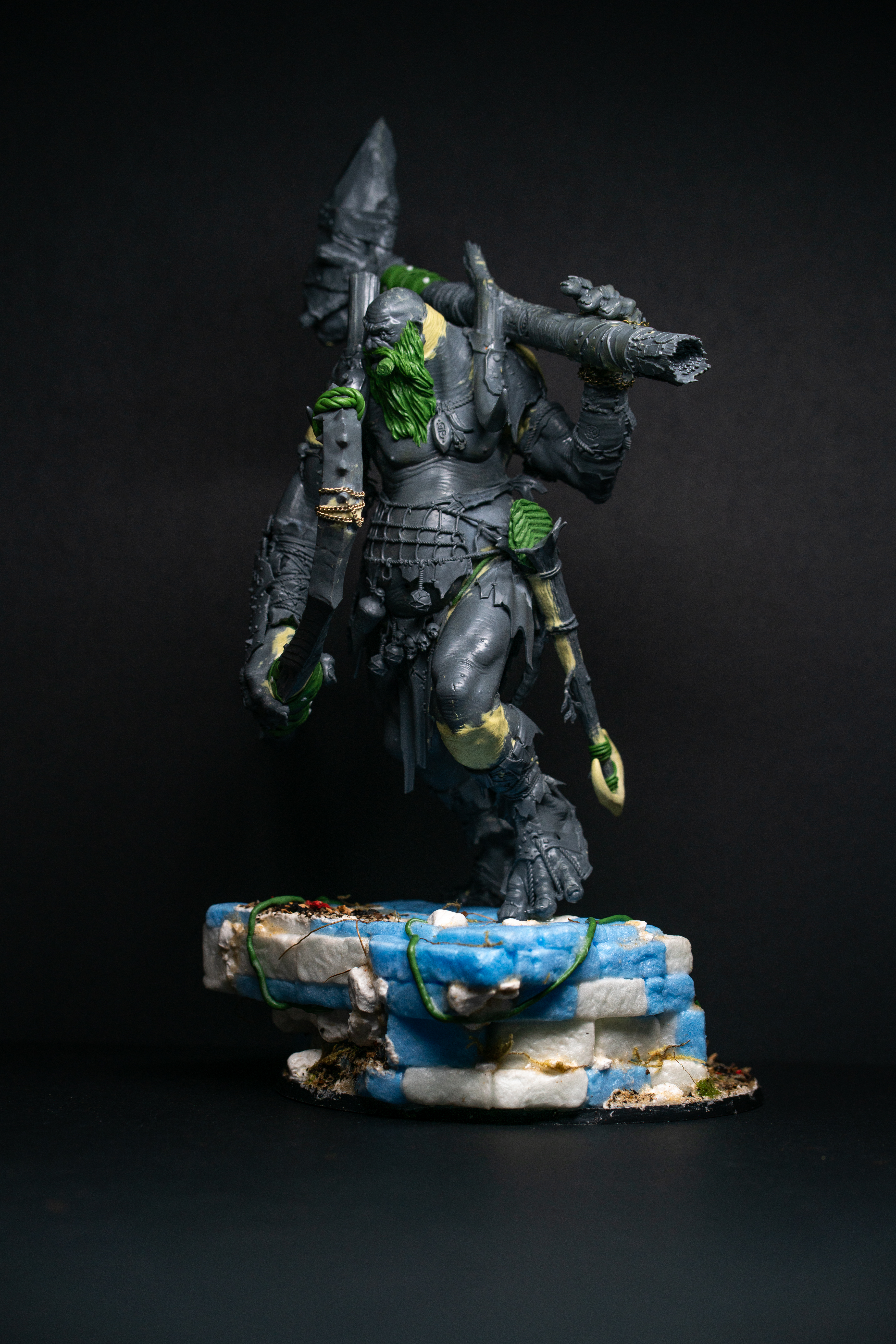 I cut up XPS foam into bricks, textured them with stones and glued them to a cardboard frame to create a twisting staircase. I imagined him walking up an old path or tower to gain a vantage point to identify his prey. By twisting the stairs, I was able to work WITH the corkscrew in the torso, creating a natural body pattern and maximising the flow of the model. To further enhance the shrewd coolness I was chasing, I sculpted a long flowing beard and pinned a Greenstuff stogie in his mouth. The massive Beast Smasher mace casually thrown over his shoulder added to that laconic pose and I created a massive bow using two Thundertusk horns pinned together and wrapped with Greenstuff. The arrow was made by cutting down a tree trunk from the Manlet Gargant kit, sculpting some leaves for fletching and an anchor for the arrow head!