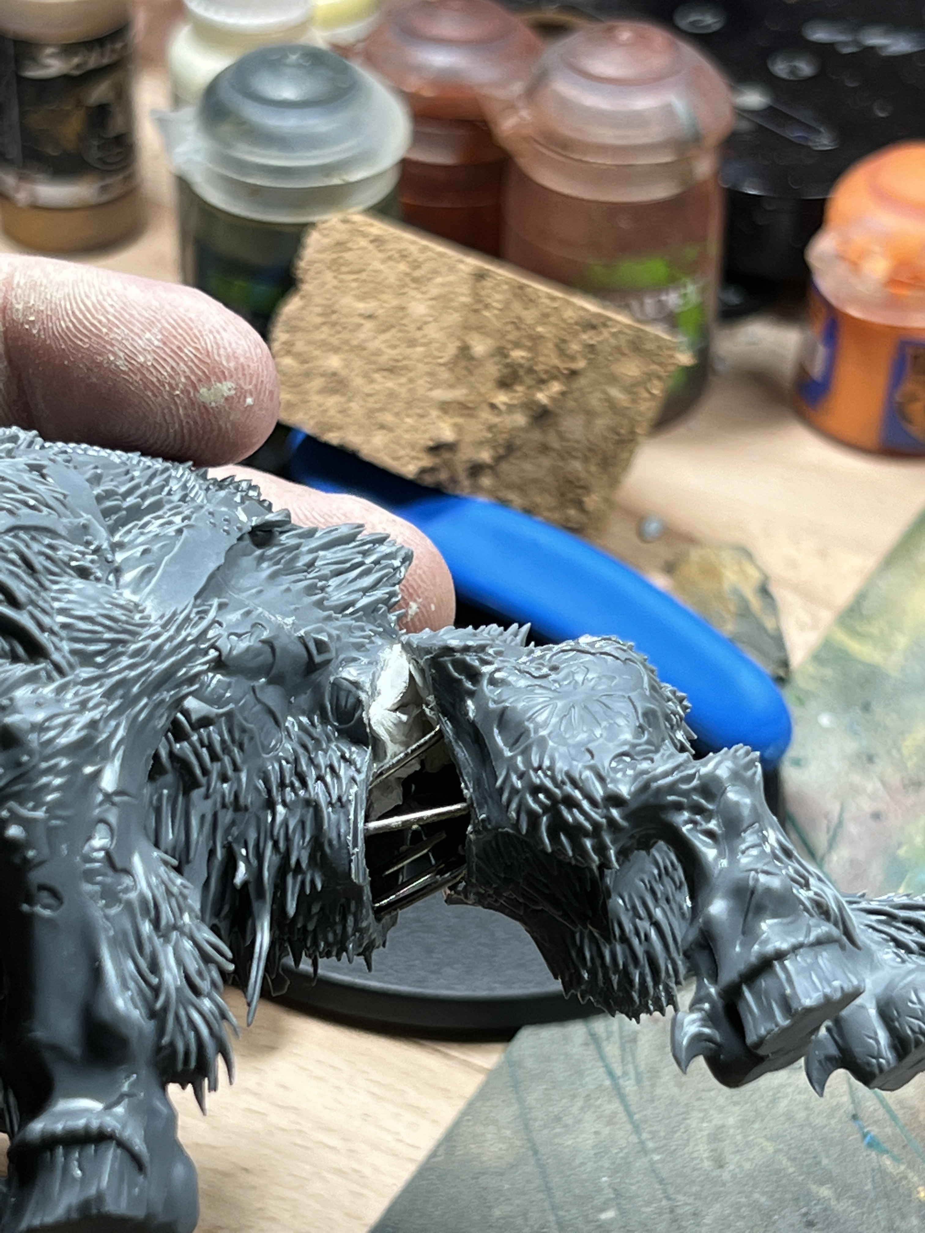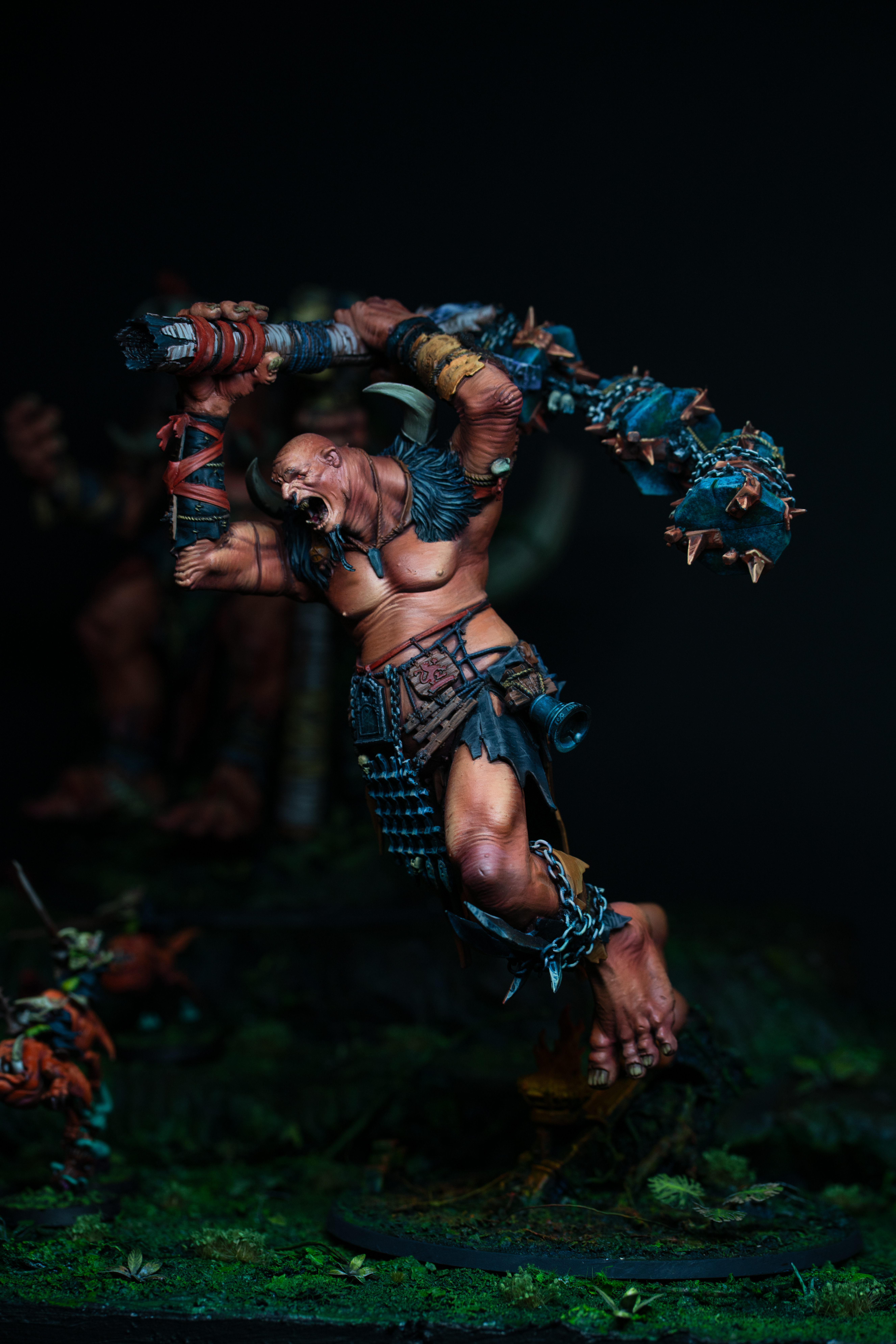 Whilst I am stoked with how all of the big lads turned out, I’m lowkey proud of the engineering that went into this idiot. There is a 3 inch long, 2.5mm thick brass rod running through his base up the length of his foot and into his calf, which creates an anchor point to perfectly cantilever his very forward-heavy momentum. In addition, there is approximately the same length of rod wound through the chains of the weapon to ensure it is as stable as it is deadly looking! Whilst it is never visible, I put a lot of energy into planning how to make all of my conversions as durable as possible. Nearly everything I design is intended for the tabletop, so it’s a firm requirement of mine in the ‘actualization’ stage that this is taken into account!