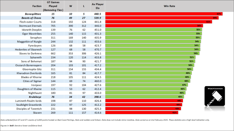 That’s a very solid percentage of armies in the green, particularly if you ignore the freakish, soon-to-be-squatted outliers. They do a very solid statistics roundup over at Woehammer although I’m not sure what the average player’s ELO means. Do they quiz people on the Electric Light Orchestra? Make them sing along to Mr Blue Sky? How would that even be relevant? Anyways, credit to GW for balancing the meta.