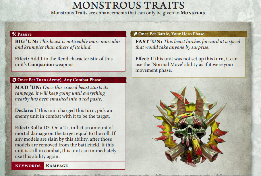 Does it boost our beloved Maw Krusha? Yes. For an update that made no direct mention of him, there’s definitely a bit there. The Mount Traits fix one of my biggest complaints (lack of Rend on the Krusha’s attacks) and best of all, taking the Mad Un trait will deliver one of the best mini-games in AOS4 and a great hobby opportunity for a Wurrgog on Wyvern, while still allowing me to piss and moan about the lack of rend. Perfection!