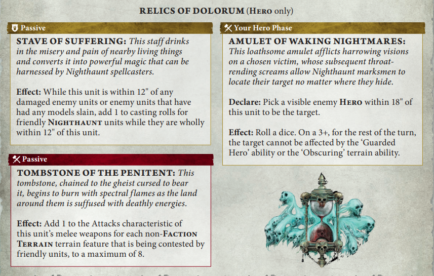 The Amulet of Waking Nightmares feels pretty useless in my opinion. Potentially removing Guarded Hero and Obscuring sounds good… in almost every other army other than Nighthaunt, whose best units are not skewed towards shooting. Oh well, there’s always one dud outta the three.