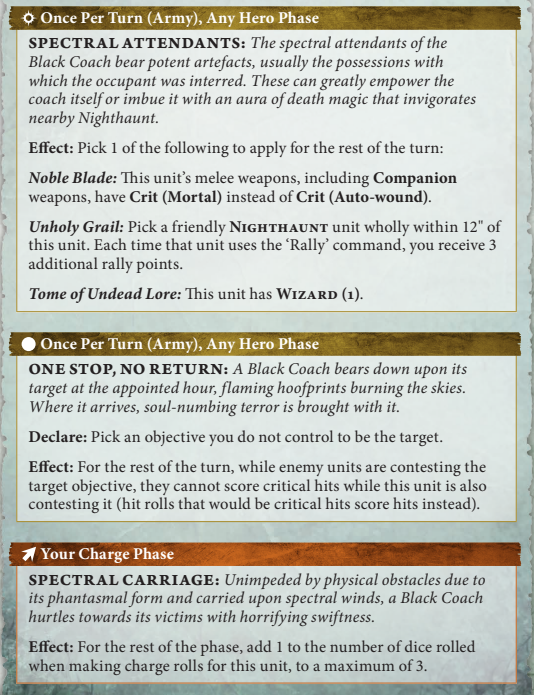First of all has built-in 3D6 charge (only in your own turn) from its Spectral Carriage ability. Next up One Stop, No Return lets you pick an objective and while the Black Coach and your opponent are both contesting it, they cannot score Crit effects – which feels extremely situational and hard to pull off. I have played a few test games with this and haven’t found it to be overly impactful, but it’s cute and could come up. Importantly, the Black Coach is now a nice synergistic piece with the new Spectral Attendants finally giving the three dudes at the back a role (other than the usual shit combat attacks).
