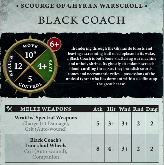 The Black Coach has been known to be pretty limp in the combat phase but it’s now rocking 13x Rend 2 Damage 2 attacks, so it can deliver some really solid output. I’ve found it helpful to get some consistent damage into your opponent’s flanking units or support pieces. Really love this change – it’s not too oppressive, but it’s some decent damage for its points considering this is a support piece.