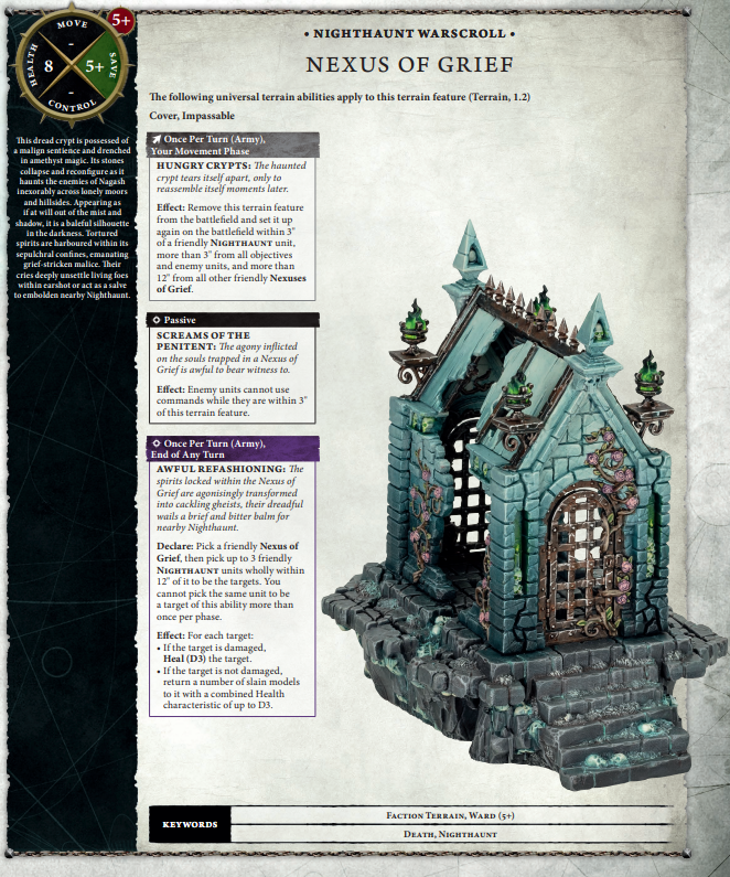 Whereas Soulblight’s terrain ended up nerfing the army’s recursion from their Index rules, the new Nighthaunt terrain is extremely strong and definitely worth picking up a box – or using the terrain that GW have been tacking onto various other terrain boxes for years. The Nexus has the ability to teleport around the board to a friendly NH unit from its Hungry Crypts ability, and it’s very generous, stipulating that you must appear outside 3″ of enemy units and objectives – but notably not 3″ inches” away from other terrain.