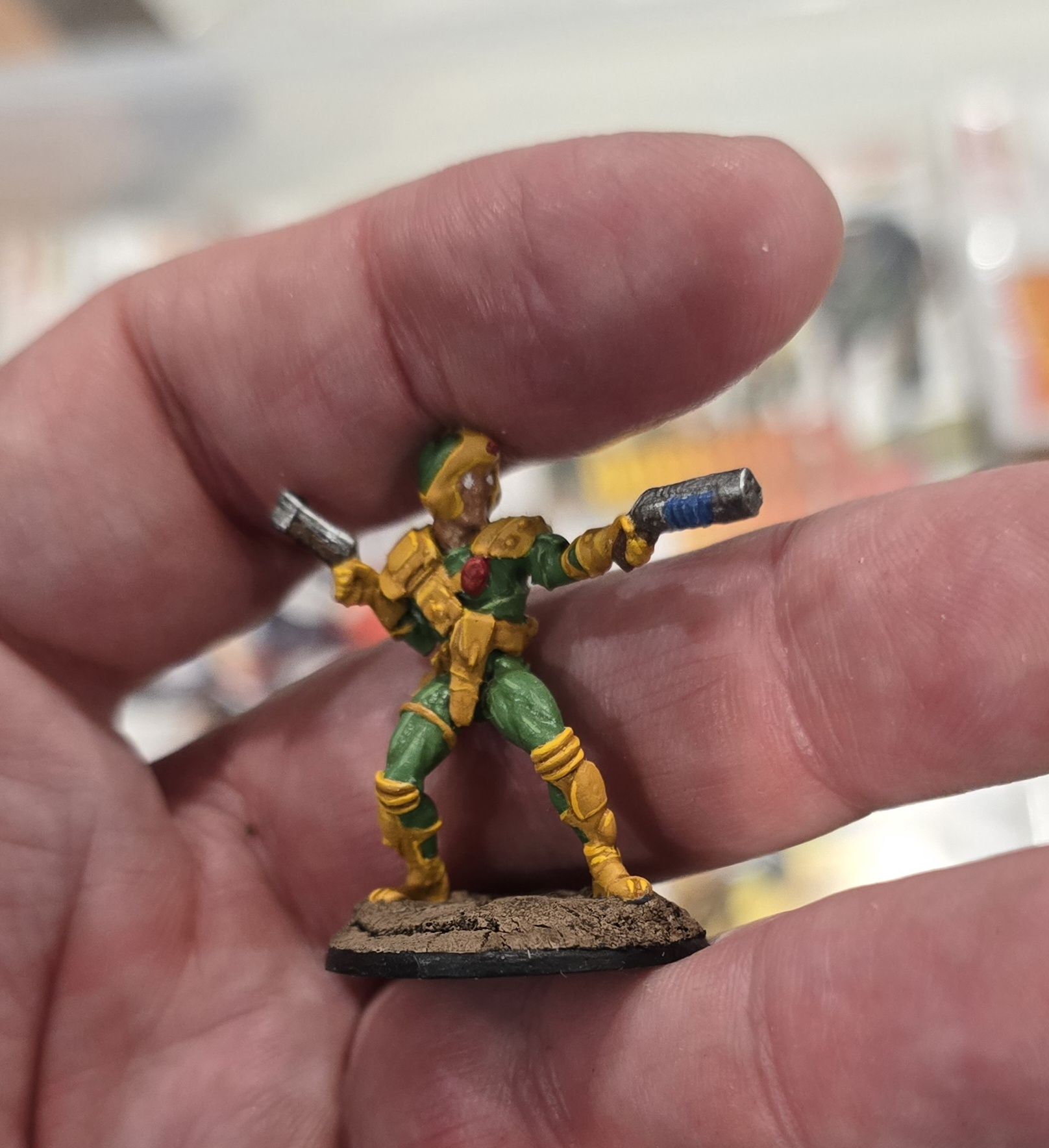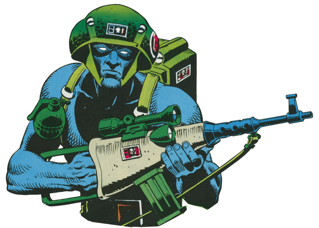 Rogue Trooper is the story of the lone survivor of a betrayed platoon seeking vengeance, with the personalities of his comrades uploaded into his gun, backpack and helmet for company. As military sci fi it would have made a natural wargame, and especially a cool painting project.
