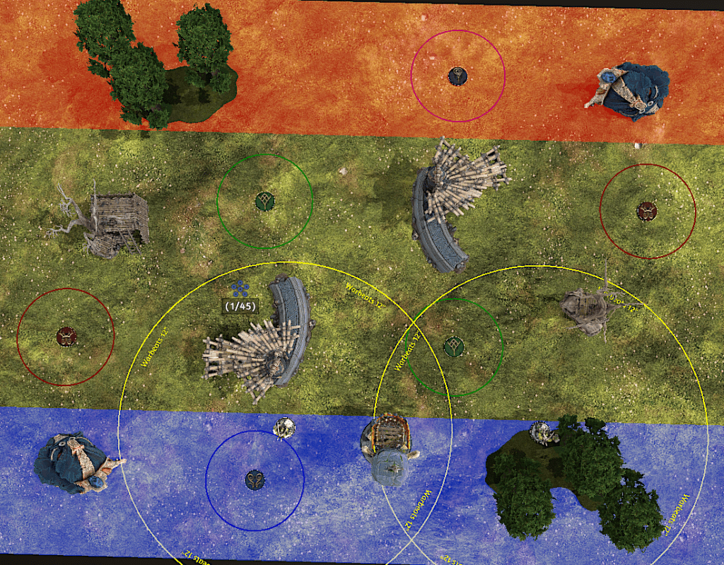 An example from Bountiful Equinox: with this positioning of the Bossrok Tower you can get two prominent terrain features trampled very early in the game, as you’re only needing 5s on the prayers to get it off (you shouldn’t need the enhanced version).