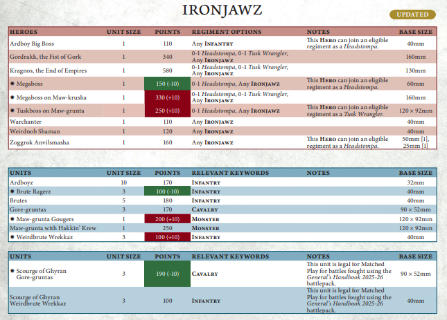 The Ironjawz Big Pigs regiment went the other way, +10 points to 430. An ever-popular choice for access to the Strike Last Rampage, and likely to remain so.