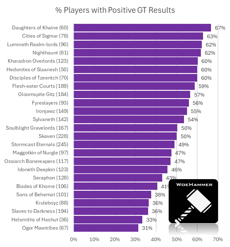 Another chart I rate is this one, showing how easy it is to do well with an army. As is always the case, DOK are eating way too well. Gloomspite and Ironjawz are clumped around the middle, with Kruleboyz, Ogors and Sons of Behemat yet again hovering around “The Destruction Zone” at the bottom of the stats: