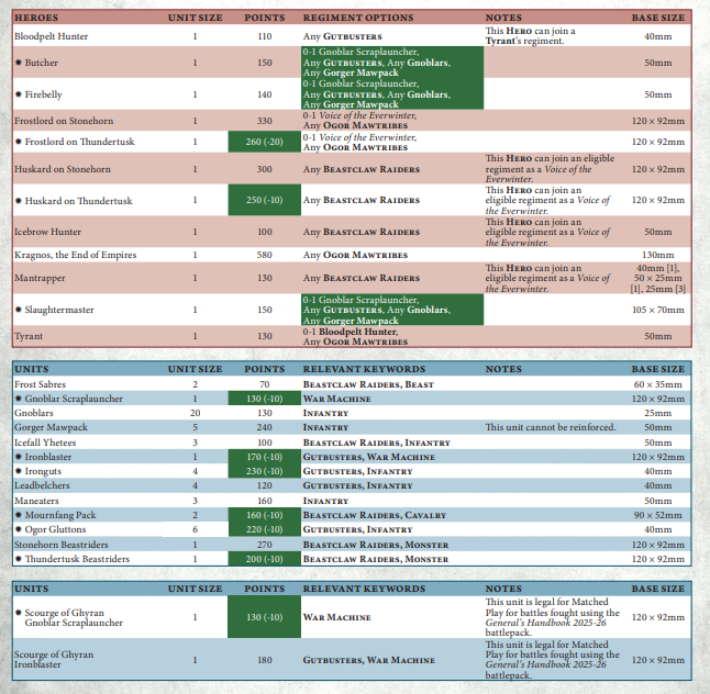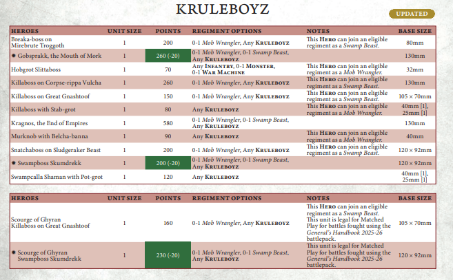Kraggy still costs 590 in SOB. This outlier seemed to be inserted at the last update to make a specific build (also featuring the Big Pigs ROR in Sons of Behemat) illegal. With Big Pigs themselves going up 10 points in this update, that is no longer required – but they either forgot to move Kraggy back down, or just don’t care.