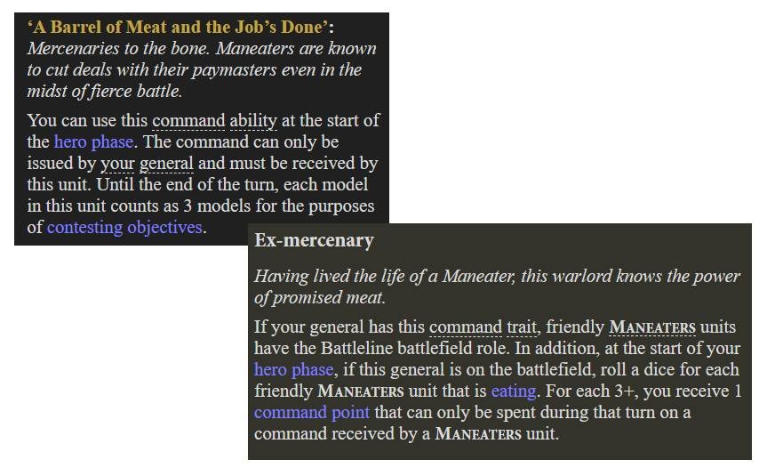 So we got lots of command points to spend on… having the same control score as a unit of Ironguts, who were actually good in a fight? And they didn’t have the GUTBUSTERS keyword, so they were locked out of all the infantry-specific buffs, which Ironguts got to make them even more useful? And for good measure, basically all the Maneater models got removed from the store during that release?